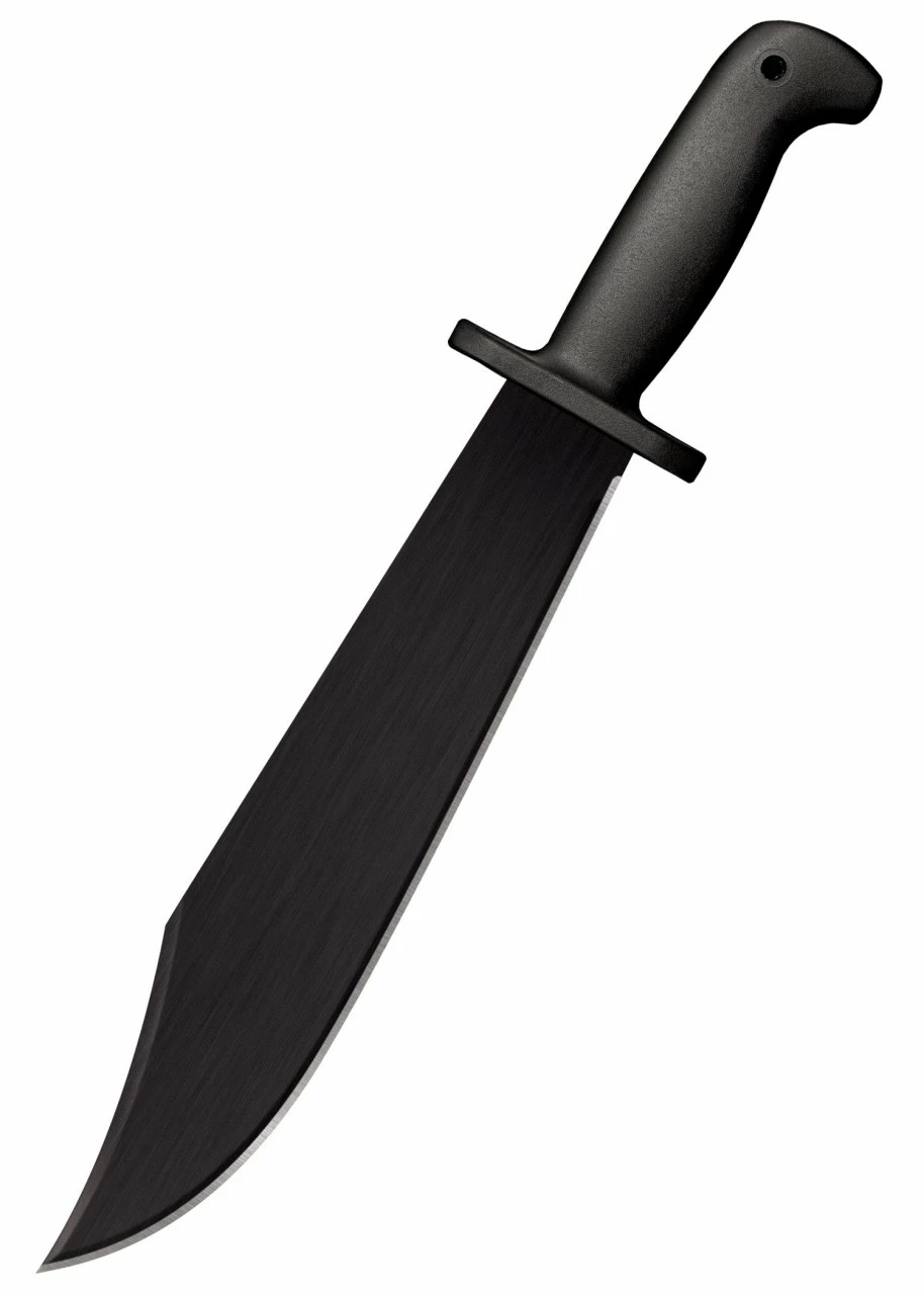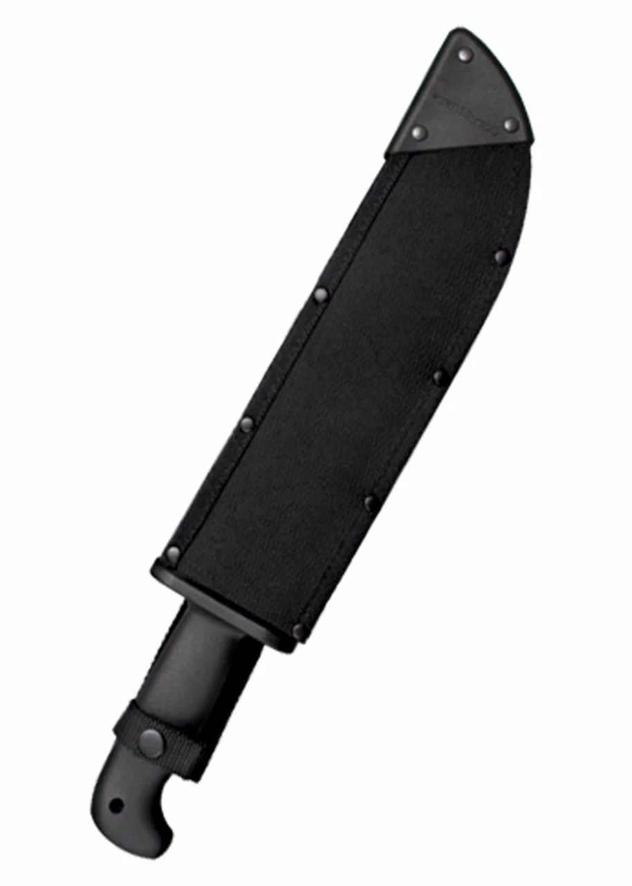Die extrabreite, ca. 30 cm lange Klinge besitzt eine pulverbeschichtete Oberfläche mit mattschwarzem Korrosionsschutzfinish und wurde im Cold Steel-Hauptsitz in Ventura, Kalifornien, geschärft. Der großzügig ausgelegte Vollerl und der Handschutz aus massivem Stahl wurden durch Spritzgussverfahren mit feinstrukturiertem, schlagfestem Polypropylen überzogen. Das Ergebnis ist ein äußerst bequemer dennoch robuster, witterungsbeständiger Griff.