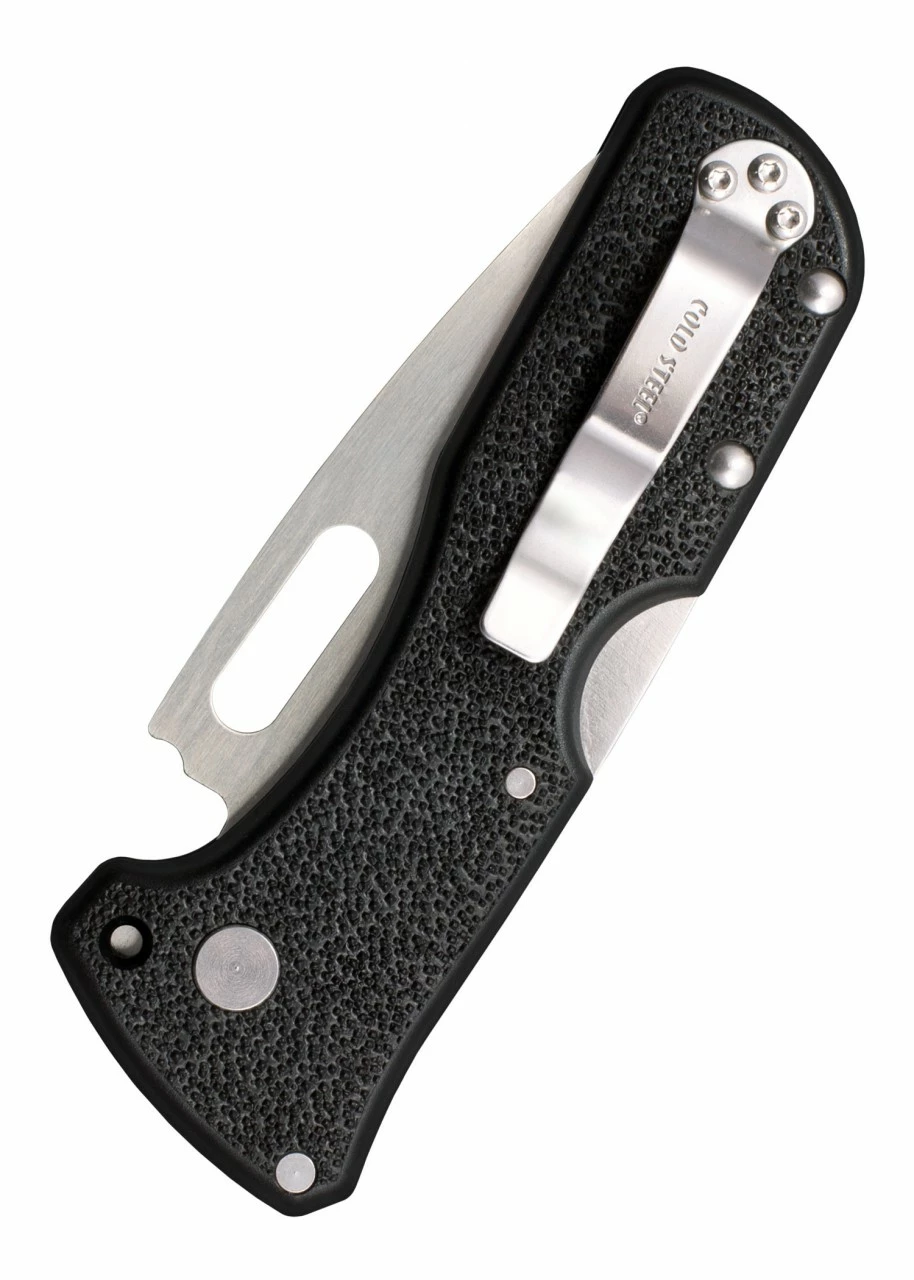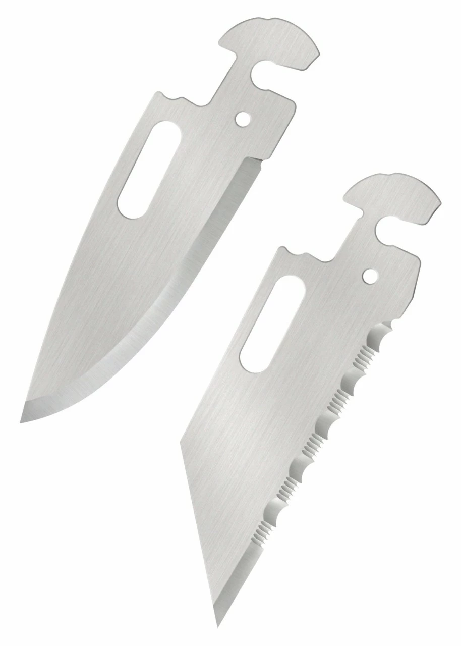 Ebenso wie Cold Steels® Click-N-Cut Messer enthält es Elemente der Tri-Ad®-Arretierung für erstklassige Sicherheit. Zum Lieferumfang gehören eine Drop-Point Klinge und eine Allzweckklinge mit Wellenschliff. Beide Klingen können mit geringem Aufwand nachgeschliffen oder entsorgt und einfach ersetzt werden. Das Einsetzen oder Wechseln einer Klinge ist einfach. Drücke bei geöffneter Klinge einfach die Lock-Bar, klapp die Klinge etwa 70° nach unten und schieb sie heraus. Klick eine neue Klinge ein und schon ist das Messer wieder voll einsatzbereit.
