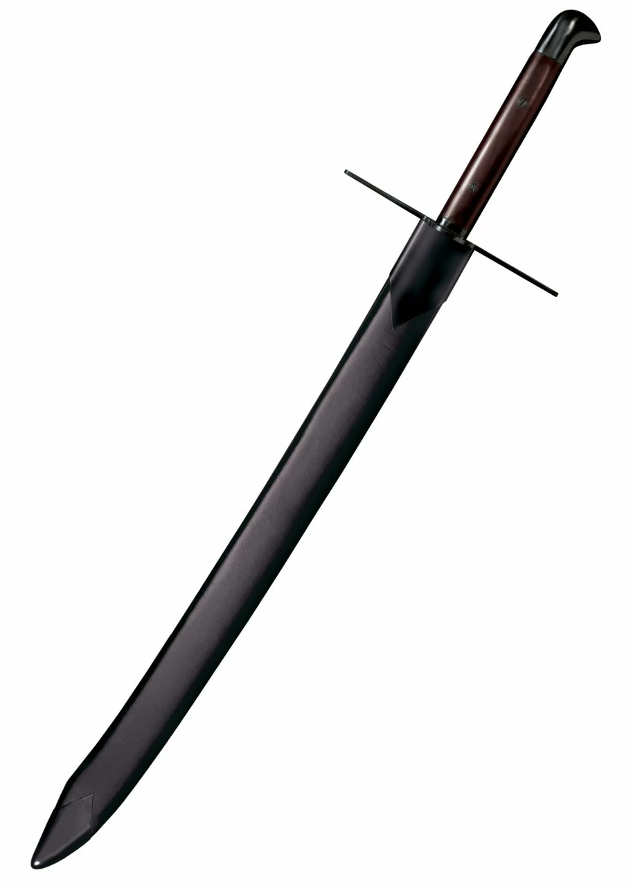 In deutschen Landen als Großes Messer bekannt, wurde dieses Schwert in den alten Zeiten in ganz Mittel- und Nordeuropa gleichermaßen von Junkern und Bauern benutzt, um Heim und Herd von Wegelagerern, Mördern, Briganten und sonstigen Gestalten von üblem Ruf zu schützen. Dank seiner stattlichen, breiten Klinge und seines großzügig ausgelegten Griffes konnte es sowohl ein- als auch zweihändig geführt werden. Damit war es sogar möglich, durch Kettenrüstung zu schneiden oder einen Mann mit einem einzigen Schlag in der Mitte durchzuhauen. Diese Version dieser schlichten und eleganten, dennoch besonders leistungsfähigen Waffe verfügt über eine scharfe, aus Karbonstahl 1055 handgeschmiedete Klinge. Die Parierstange und der stattliche Knauf sind aus gebläutem Stahl gefertigt. Die Griffschalen aus Holz sind mit der bis zum Knauf durchgeschmiedeten Angel vernietet.