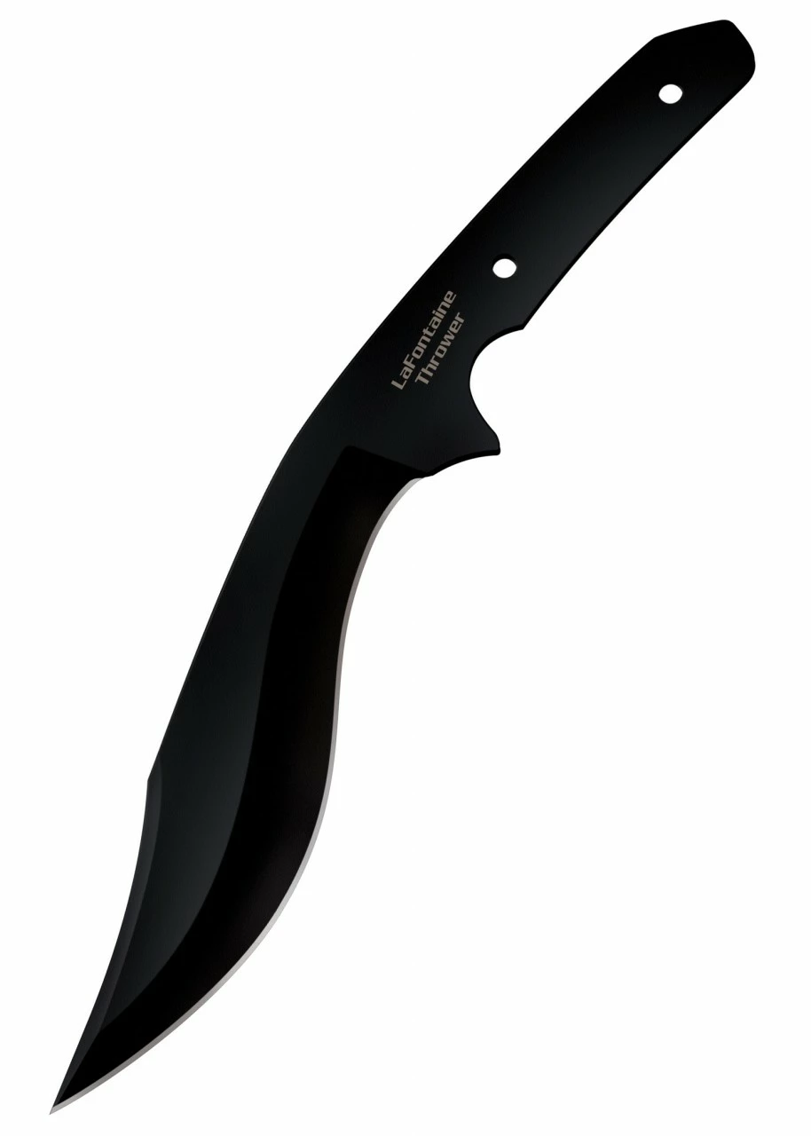 Das LaFontaine Wurfmesser ist stark geschwungen und verfügt über einen ausladenden Bauch, eine scharfe Schneide und einen spitzen Ort, der von einer ungeschärften Rückenschneide akzentuiert wird. Mit seinem integrierten Fingerschutz, der verhindert, dass die Hand an die scharfe Schneide gerät, und seinem spitz zulaufenden Griff, der beim Werfen mühelos von der Hand gleitet, eignet sich das LaFontaine hervorragend als Messer zum Schneiden und Schlitzen und verfügt gleichzeitig über hervorragende Wurfeigenschaften.