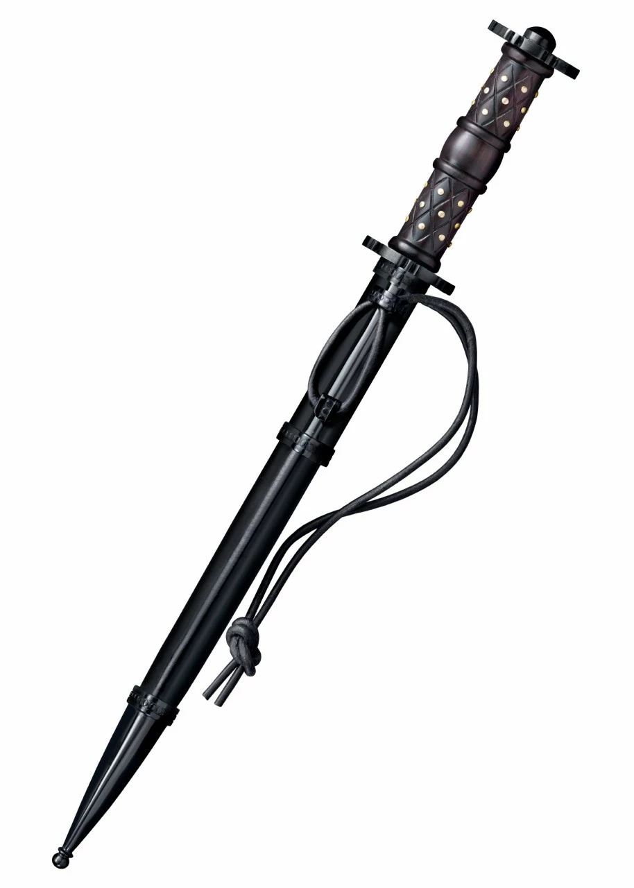 Die lange, gerade Klinge von Cold Steels® Scheibendolch ist hohlgeschliffen und verfügt über drei Schneiden. Sie ist unglaublich biegesteif und verjüngt sich zu einem extrem spitzen Ort. Außerdem wurde sie tief gebläut und ihre Schneidkanten von Hand poliert, was dem Dolch eine wunderschöne Optik verleiht. Der gedrechselte Griff aus malaysischem Salholz ist mit aufwendigen Handschnitzereien verziert und mit kleinen Messingstiften versehen, die zugleich dekorativ sind und für mehr Griffigkeit sorgen. Die stilechten Scheiben am Parier und Knauf wurden mit Feilarbeiten verschönert und bieten hervorragenden Schutz für die Hand.