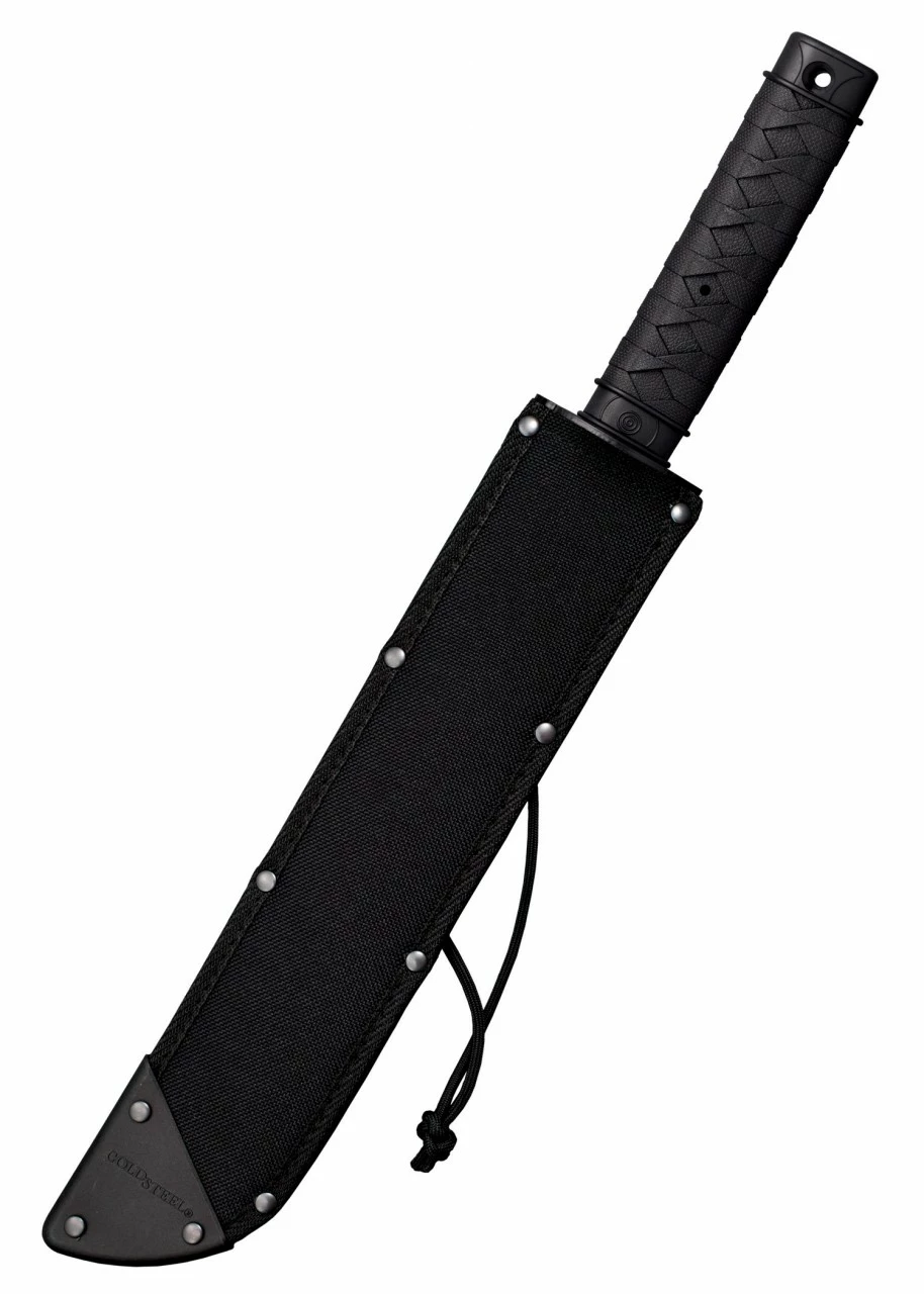 Cold Steel hat keine Mühe gescheut, um die Optik eines traditionellen Griffes mit Kordelwicklung, Fuchi (Griffzwinge) und Kashira (Griffkappe) nachzuahmen. Dabei wurden aber moderne Materialien verwendet, die weder schrumpfen, noch anlaufen, verrotten oder sich verformen werden, und die nur minimalste Pflege erfordern, um konstante Spitzenleistung zu liefern. Diese taktischen Macheten werden in Cold Steels Hauptsitz in Ventura, Kalifornien, geschärft. Um sie bequem tragen und aufbewahren zu können, ist bei jedem Modell eine Cor-Ex™ Scheide im Lieferumfang enthalten.