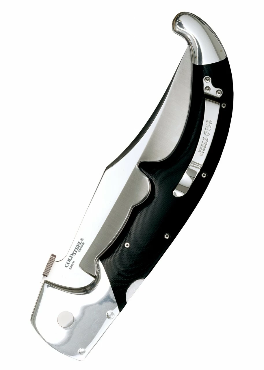 Die Espada-Serie ist das Ergebnis der Zusammenarbeit zwischen dem Messermacher Andrew Demko und Cold Steels Präsidenten Lynn C. Thompson. Diese Kollektion ist die perfekte Fusion von Demkos genialem technischem Talent und Thompsons umfassendem Wissen in Bezug auf Klingenwaffen und -werkzeuge. Trotz ihrer stattlichen Größe bleiben diese riesigen, hocheffizienten Klappmesser erstaunlich leicht zu tragen. Sie wurden so gekonnt konzipiert, dass sie bequem in Deine Tasche passen, und Du wirst bald vergessen, dass Du überhaupt solch eine große, imposante Klinge mit Dir führst. Dank Demkos patentierter Daumenscheibe kann das Espada direkt beim Herausziehen aus der Tasche am Taschensaum geöffnet werden, und ist somit in null Komma nichts einsatzbereit!