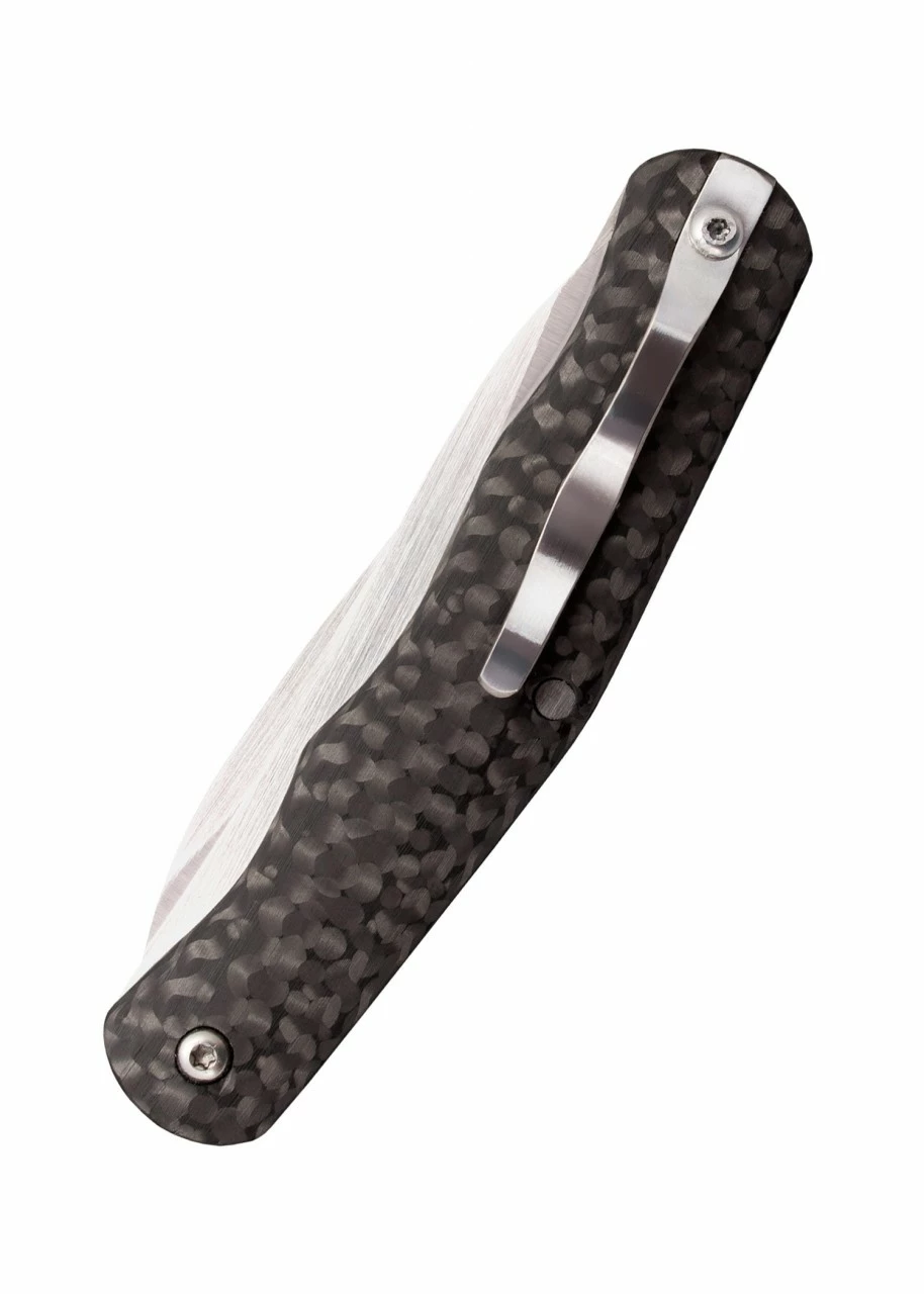 Seine zwei Klingen (eine mit glatter Schneide, eine mit Wellenschliff) sind aus erstklassigem CPM S35VN-Stahl gefertigt. Sie liegen bequem und sicher zwischen zweifarbigen, polierten Kohlefaserschalen. Und mit einer Rockwellhärte von 60-61 HRC verfügen diese rasiermesserscharfen Klingen über eine hohe Kantenfestigkeit.